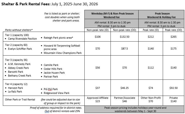 Shelters may be reserved from 8:30 a.m.-1:30 p.m. or 3:00 p.m. to dusk. Other park sites can be reserved between 8:30 a.m. and dusk.