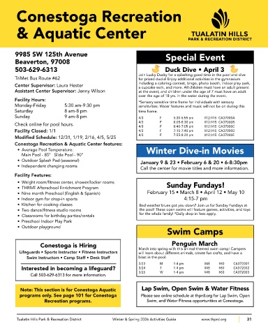 programs only. See page 101 for Conestoga Please see online schedule at thprd.org for Lap Swim, Open
